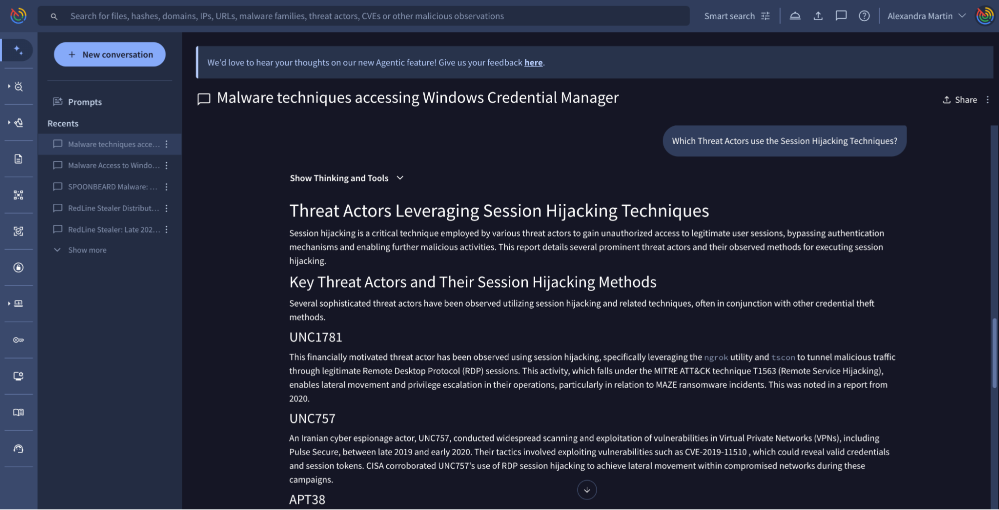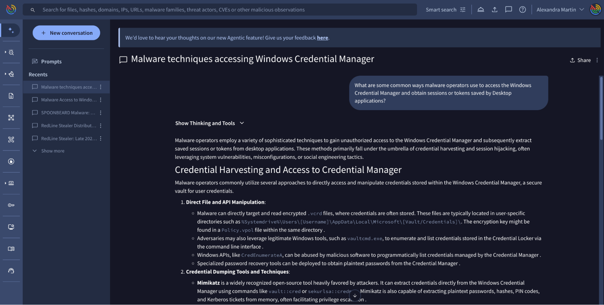 You can start the conversation as you like, for example “Provide a list of file hashes related to the RedLine infostealer”, in any language: “Proporcione una lista de hash de ficheros relacionados con el infostealer RedLine”, “Fournissez une liste des hachages de fichiers liés au voleur d'informations RedLine”. You can also instruct Agentic regarding the format, language of the output.