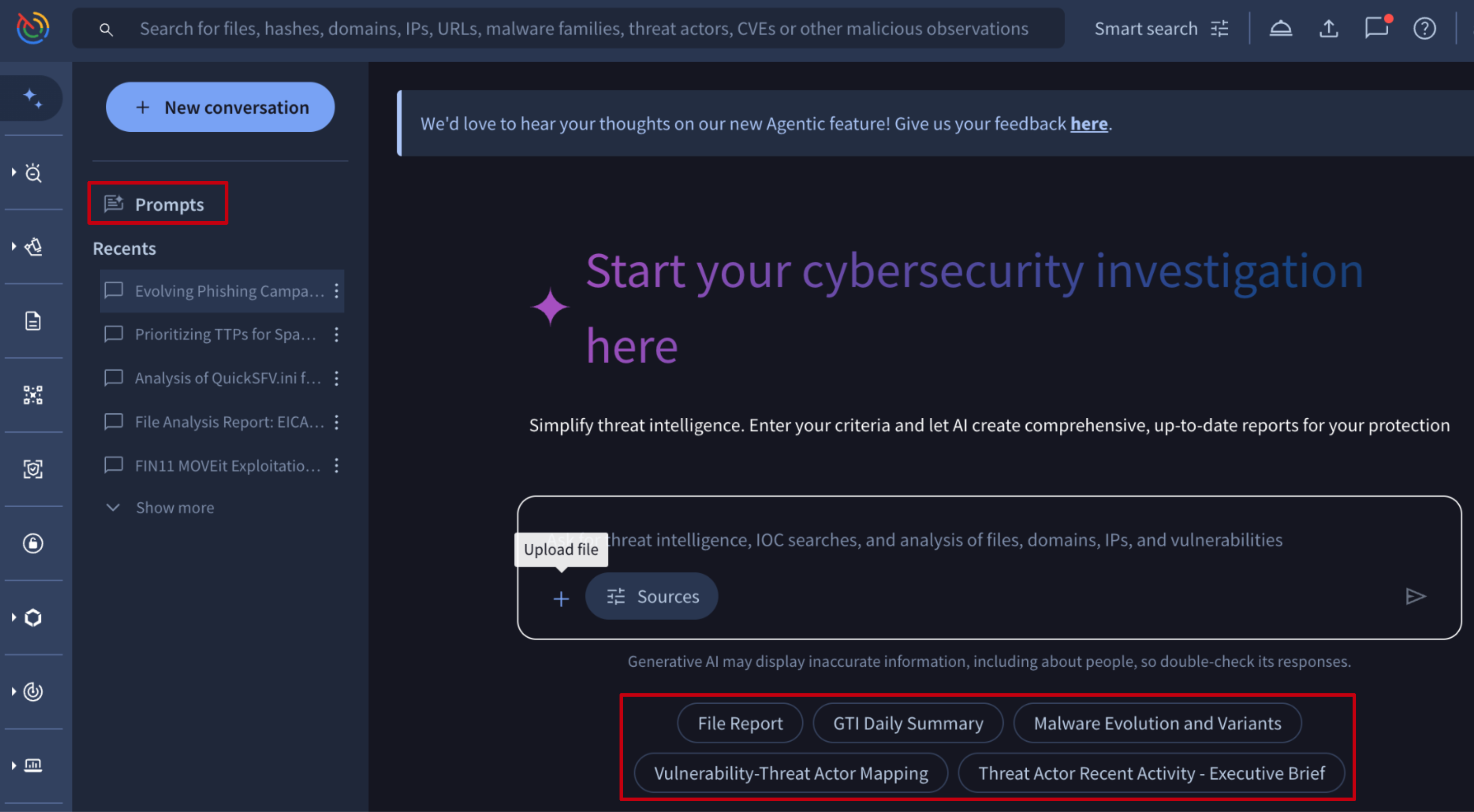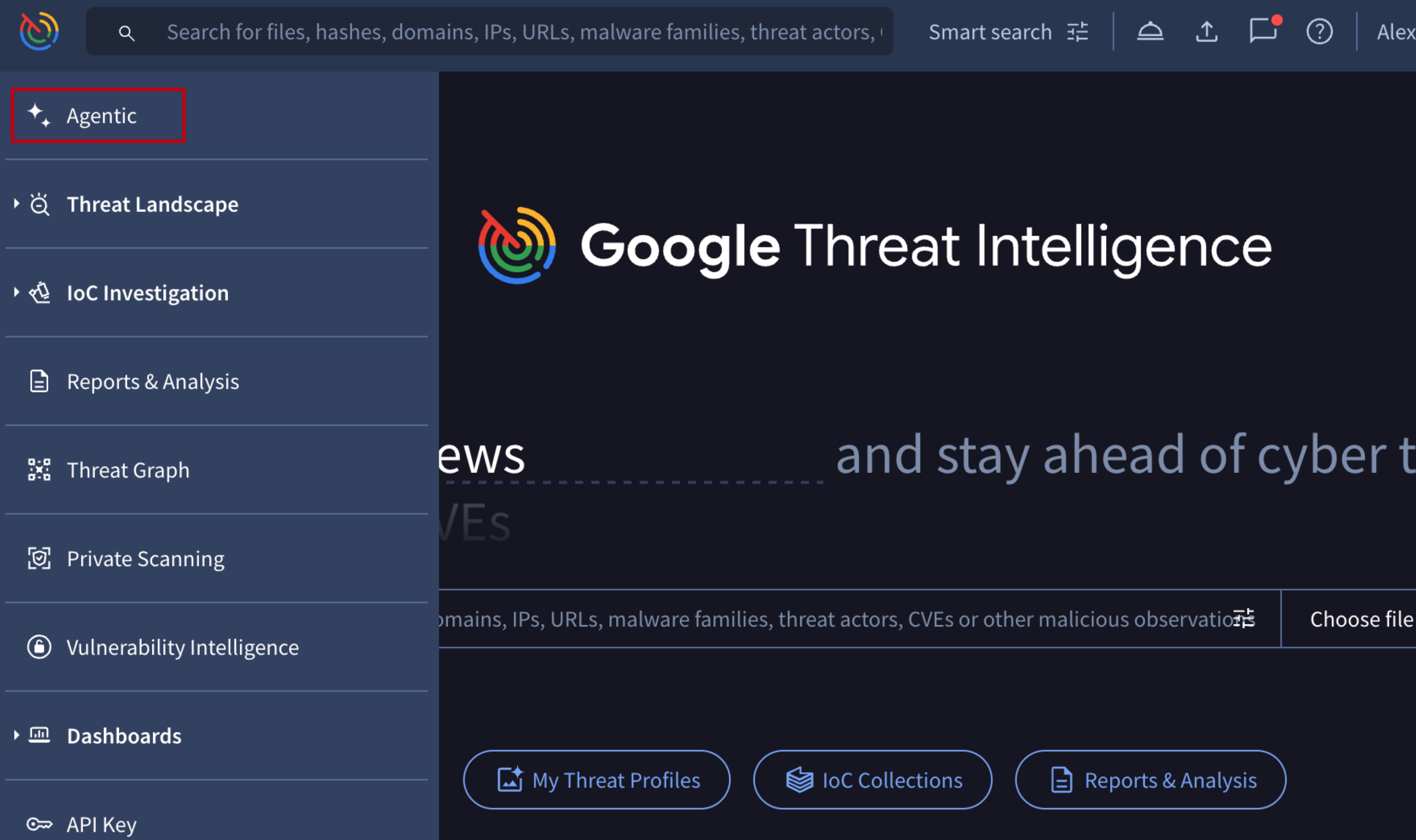 Built on Large Language Models (LLMs) and grounded in Google Threat Intelligence comprehensive security dataset, the Agentic Platform simplifies threat intelligence. This conversational interface lets you interact directly with specialized AI agents to quickly analyze threats, accelerate security investigations, and receive immediate, precise answers.